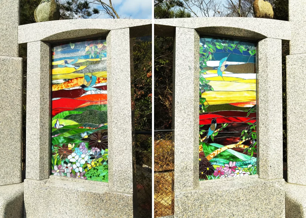 父方も母方も神戸の実家からバスなどを乗り継いで行くところにお墓があるので、私にとって大切なことがうまくいきますように…と一方的に去年末にお願いしたので、一段落した最近、お礼も兼ねてご挨拶するためにお墓参りに行ってきました。写真のステンドガラスは父方のお墓があるところに飾られているものです。